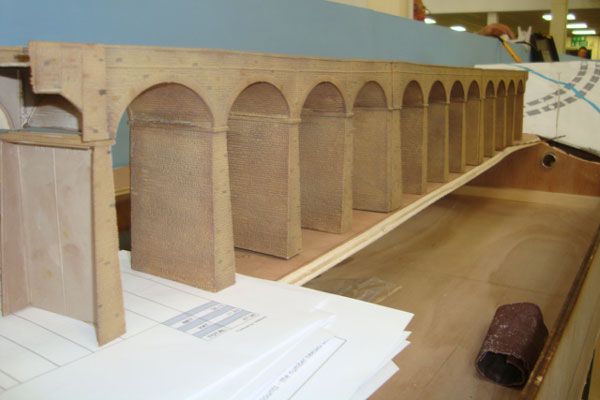 The back-scene has been painted light blue to enhance the building and colouring of the landscape scenery, and also give a base colour for the final back-scene design